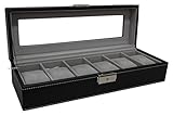 For all of those watch enthusiasts this is the perfect vintage-style box to store and carry your favorite timepieces. Beautiful and elegant, it will cushion the owner’s watches securely on individual pillows. The lid features a clear glass to enable easy viewing of the watches inside. FEATURES: Vintage-style design; Solid wood construction; Black PU Leather; 6 total storage pillows; Lock and key for added security; Fully lined in a grey, anti-tarnish velvet material; Individual compartments: 3.25″(D) x 1.75″(W) x 1.375″(H); Dimensions: 4.25″(D) x 12.75″(W) x 3.25″(H)