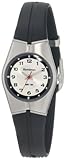 Elegant contours and contrasting silver and black tones lend eye-pleasing effects to the Women’s Black and Silver-Tone Sport Watch from Armitron. Defined by its unique shape, the silver-tone case frames a small, silver sunray dial edged in black. With clear, easy-to-read, black Arabic numbers that stand out against the white of the outer dial, this sleek watch also features a sweep second hand in a colorful, red accent and white dot indexes marking the hours on the black edge. Securing to the wrist with a flexible and durable, black resin strap that fastens with a silver-tone buckle, this slender watch offers precise quartz movement and a water-resistant depth of 165 feet (50 meters).