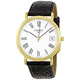 Quartz movement. Black leather strap. Buckle clasp. Gold PVD stainless steel bezel and case. Sapphire crystal. Push-Pull crown. White dial with black-tone hands. Date display. Case: 34mm in diameter x 6mm thick. Bracelet/strap: 14mm wide x 8.5in long. Water-resistant up to 30 meters. 1-year limited third party warrantyThe handsome Tissot Men’s T-Classic Desire Leather Watch is designed with Roman numeral hour markers for a clean, classic appearance. The timepiece is constructed with a stainless steel case, a stationary gold-tone-stainless-steel bezel, and a black leather wristband with an adjustable buckle clasp. A strong sapphire window shields the white dial face, which features striking black Roman numeral hour indexes, black minute markers, and complementary black watch hands. Powered by quartz movement, the watch is water resistant to 99 feet.